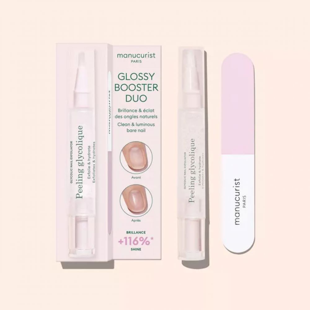 Ravive la brillance et l’éclat des ongles naturels La routine glossy nail, sans vernis, pour raviver instantanément la brillance et l’éclat des ongles naturels. Idéal pour les ongles ternes, le Glossy booster duo combine l’action exfoliante du Peeling glycolique à l’action lissante du Polissoir pour des ongles brillants et éclatants en quelques secondes seulement. Inspiré de la manucure japonaise.