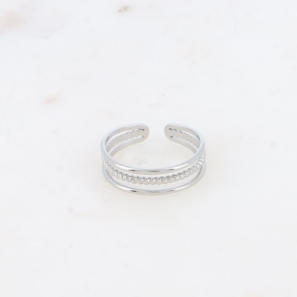 Bague en acier inoxydable composée de trois anneaux dont un torsadé.