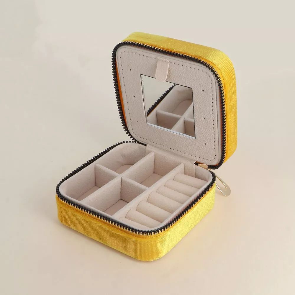 Boite à bijoux en velours agrémentée d’une fermeture éclair en laiton doré.