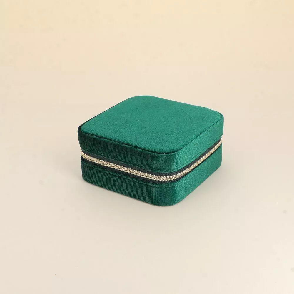Boîte à bijoux en velours agrémentée d’une fermeture éclair en laiton doré.
