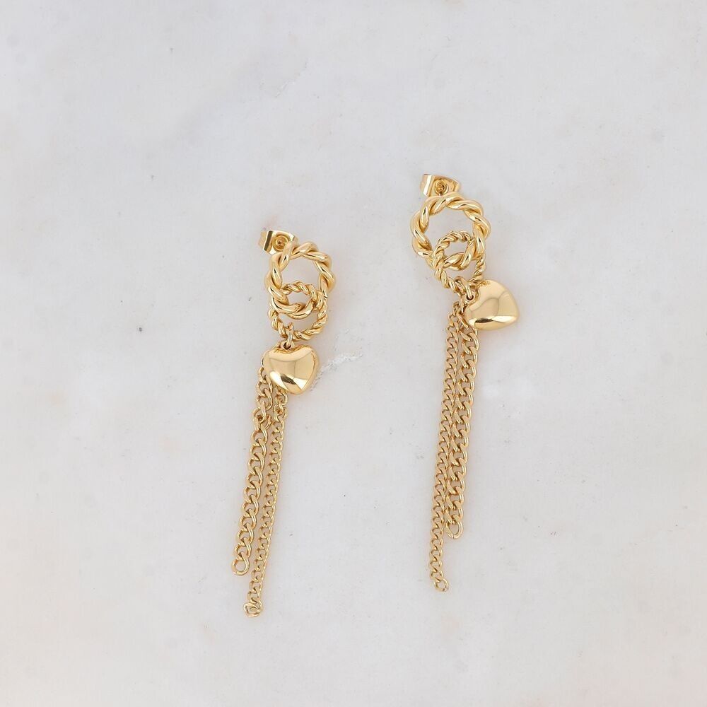 Boucles d’oreilles puces en acier inoxydable composées de deux anneaux torsadés, d’un coeur et de deux chaînes pendantes.