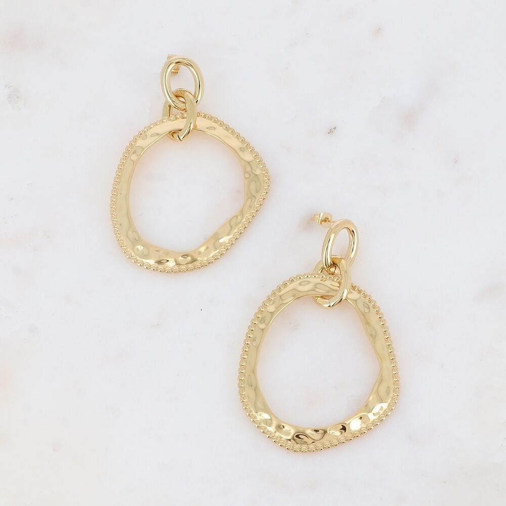 Boucles d’oreilles pendantes en acier inoxydable composées de 2 anneaux ovales et d’une pièce ajourée aux contours milgrain.