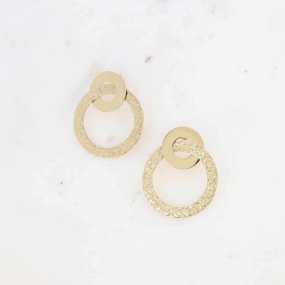 Boucles d’oreilles à puce en acier inoxydable composées d’un empiècement en forme de double anneau, l’un lisse et l’autre plus grand texturé.
