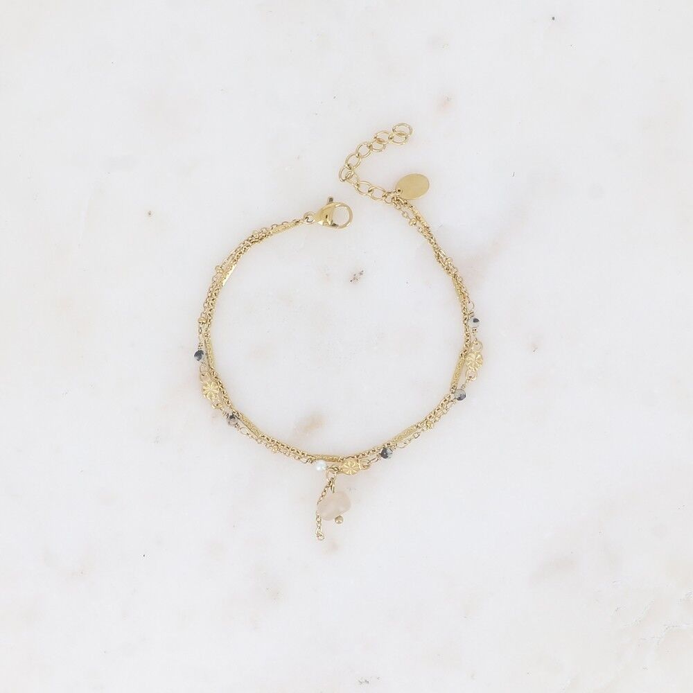 Bracelet sur chaîne en acier inoxydable composé de 2 rangs, une maille forçat alternée plate et une maille avec boules avec des anneaux ronds striés et de pierres naturelles.