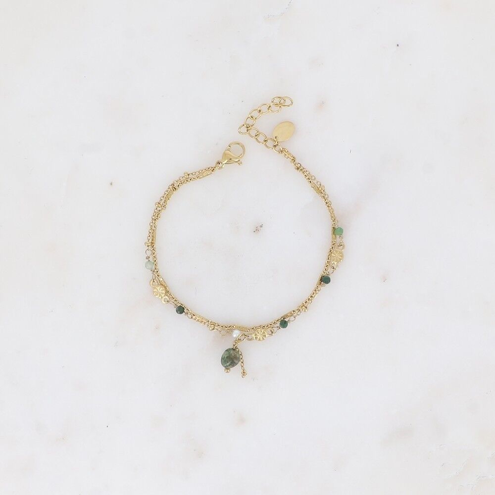 Bracelet sur chaîne en acier inoxydable composé de 2 rangs, une maille forçat alternée plate et une maille avec boules avec des anneaux ronds striés et de pierres naturelles.