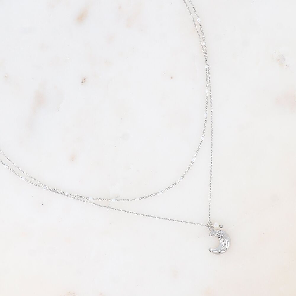 Collier sur chaîne en acier inoxydable composé d’une fine maille serpent, d’un pendentif en forme de lune texturé avec sa petite étoile ornée d’un cristal taillé, ainsi que d’une chaîne pendante avec une perle d’eau douce.