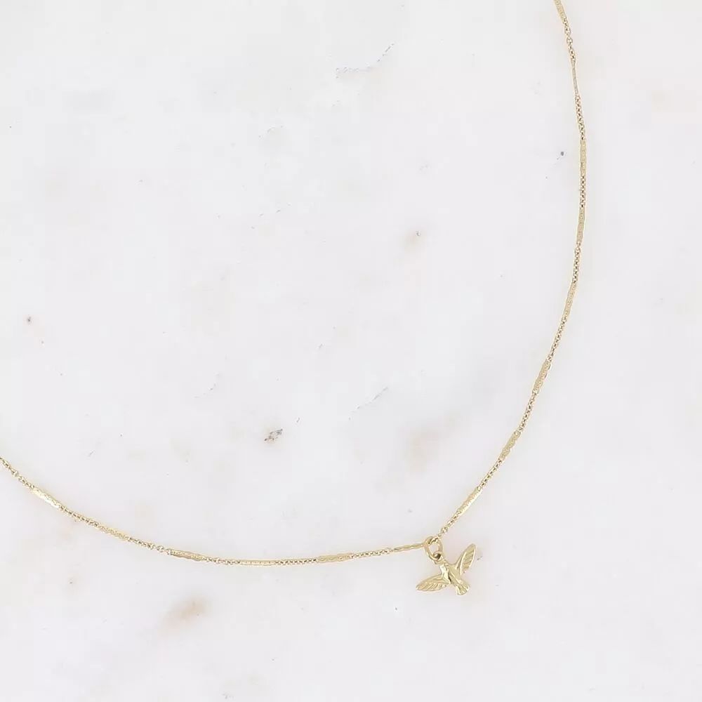 Collier sur chaîne en acier inoxydable composé d’une fine maille forçat alternée aplatie avec un pendentif sous la forme d’un petit oiseau.