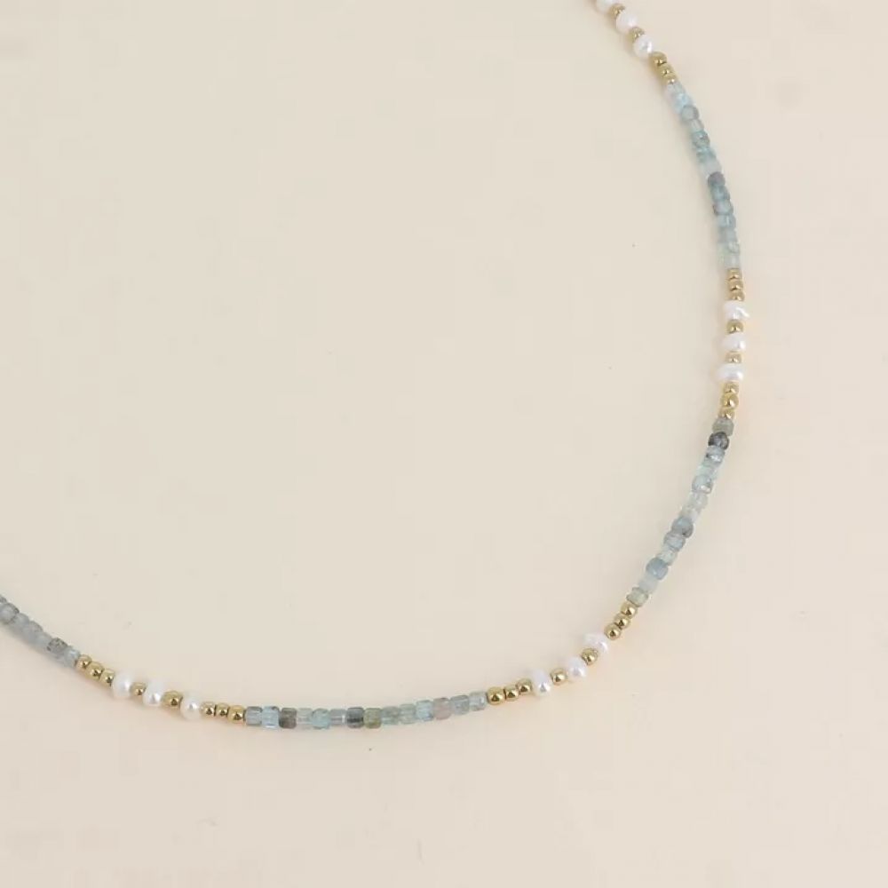 Collier sur câble composé de pierres naturelles cubiques, de petites perles d’eau douce et de perles en acier inoxydable.