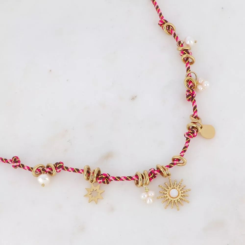 Collier sur cordon composé d’un jeu de breloques en pierre naturelle et en acier inoxydable, orné d’un soleil au coeur en pierre naturelle.
