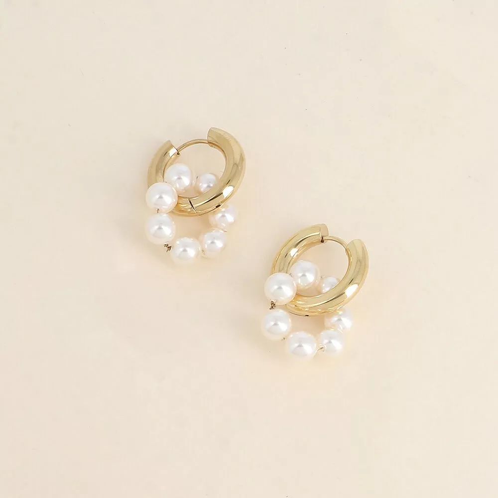 Boucles d’oreilles type créoles avec fermoir à charnière en acier inoxydable composées d’un anneau embelli par des perles de résine blanche.