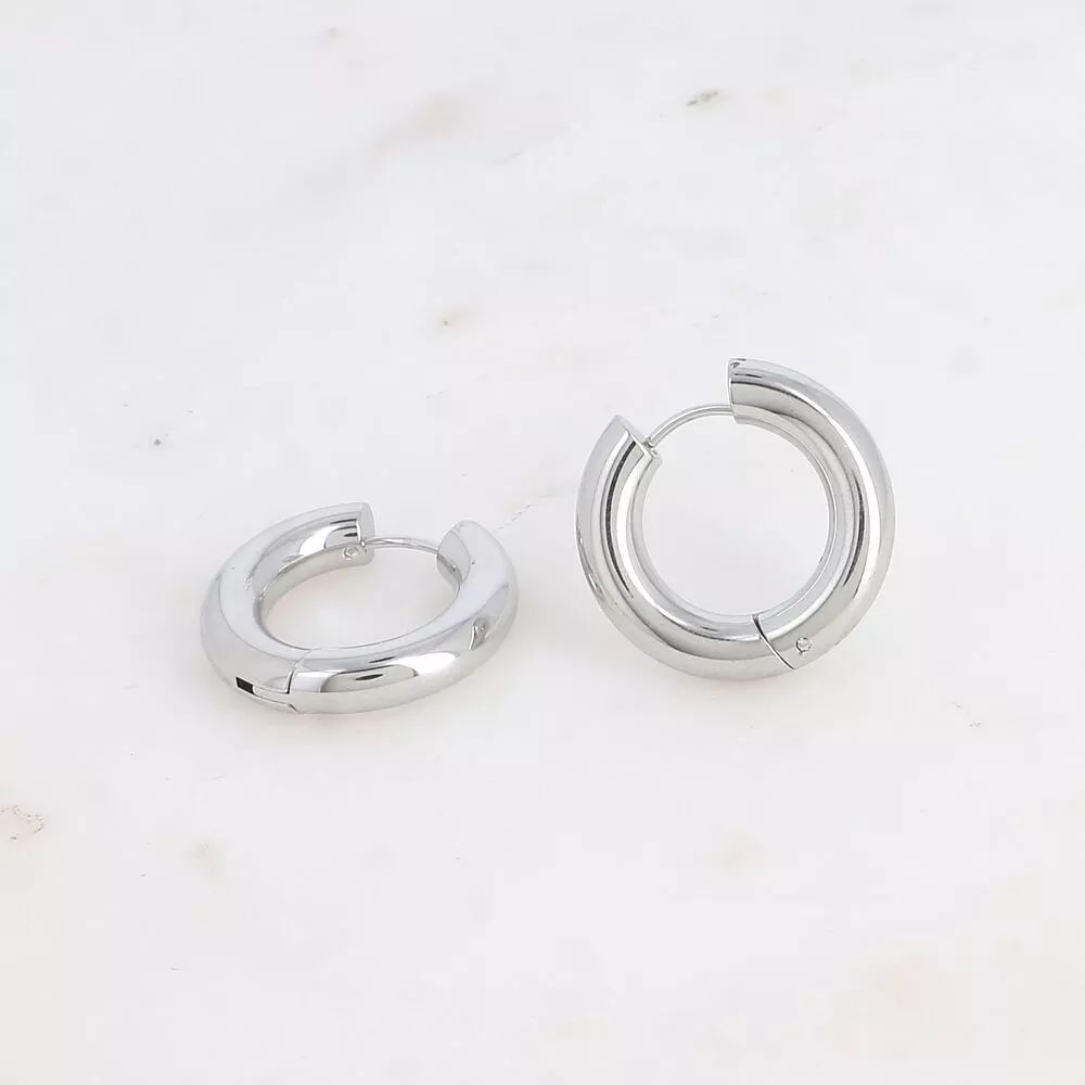 Boucles d’oreilles type créoles avec fermoir à charnière en acier inoxydable composées d’un anneau épais rond.
