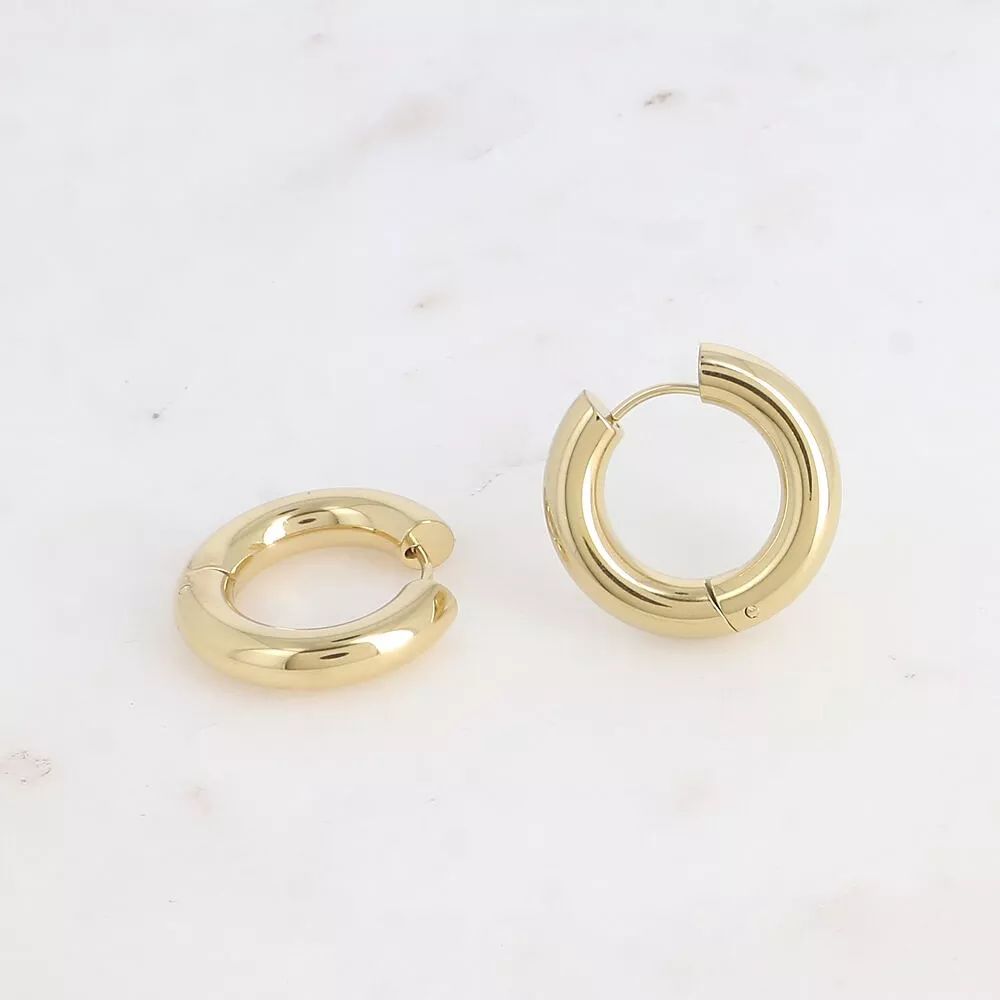 Boucles d’oreilles type créoles avec fermoir à charnière en acier inoxydable composées d’un anneau épais rond.