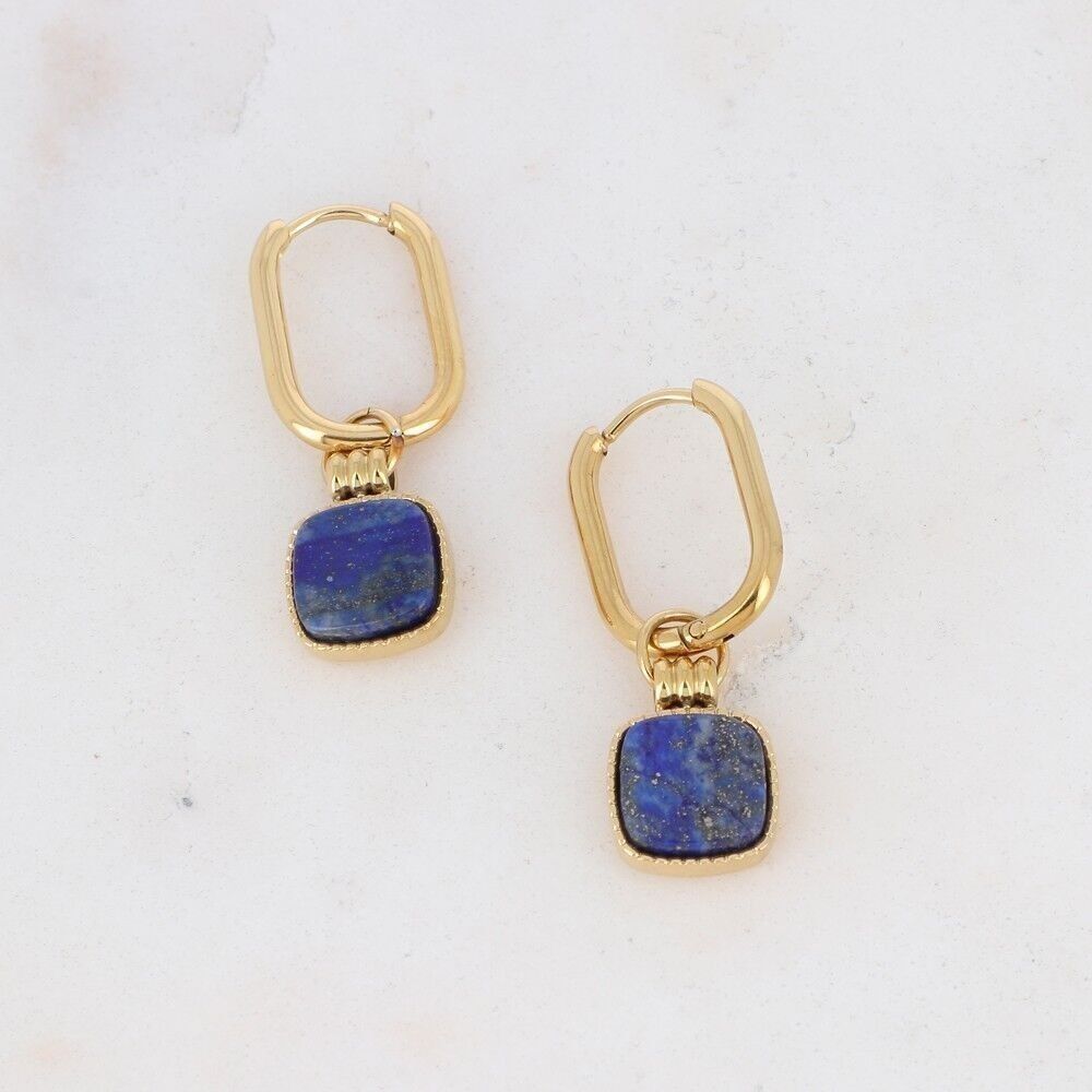 Boucles d’oreilles type créoles à fermoir charnière ornées d’un pendentif carré en pierre naturelle.