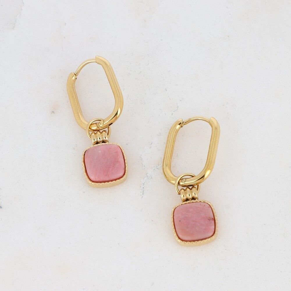 Boucles d’oreilles type créoles à fermoir charnière ornées d’un pendentif carré en pierre naturelle.
