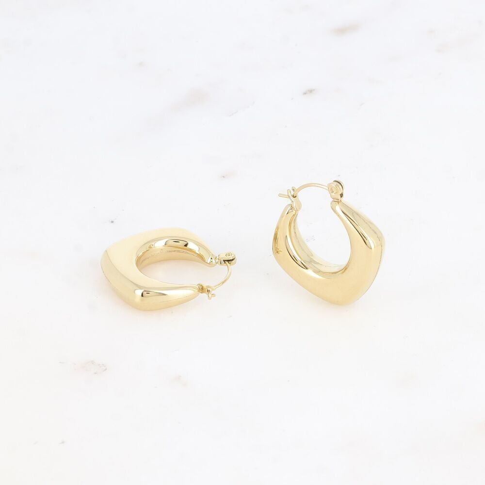 Boucles d’oreilles type créoles à cliquet en acier inoxydable composées d’un anneau courbé et carré.