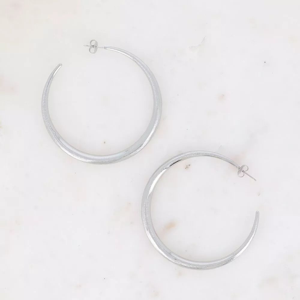 Boucles d’oreilles type créoles en acier inoxydable composées d’une anneau fine en forme de croissant de lune effet brossé.