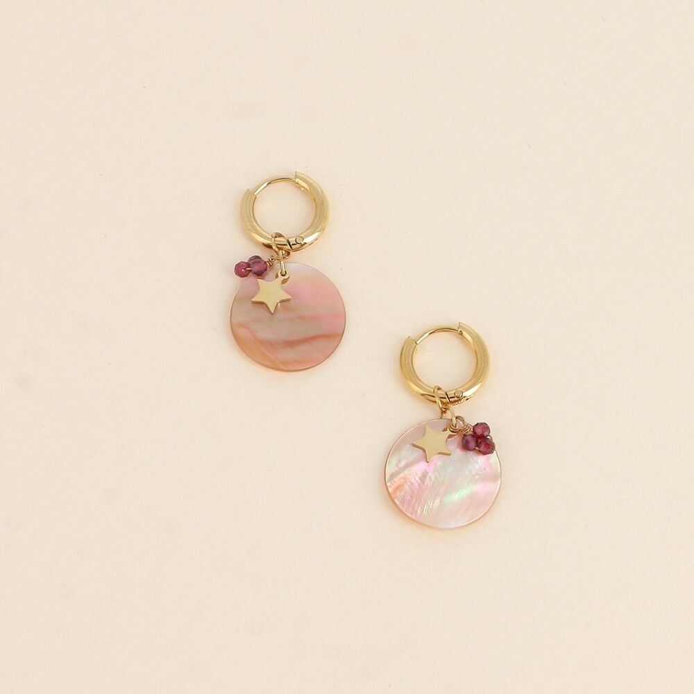 Boucles d’oreilles type créoles avec fermoir à charnière en acier inoxydable composées d’une pièce ronde nacrée, de 3 petites pierres naturelles et d’une pastille étoilée.