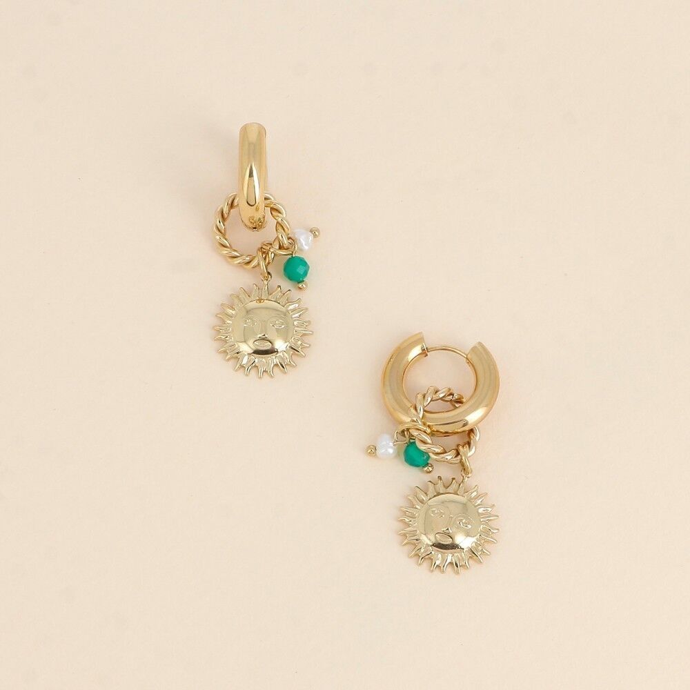 Boucles d’oreilles type créoles avec fermoir à chanière en acier inoxydable compoées d’un soleil souriant, d’une pâte de verre et d’une perle d’eau douce.