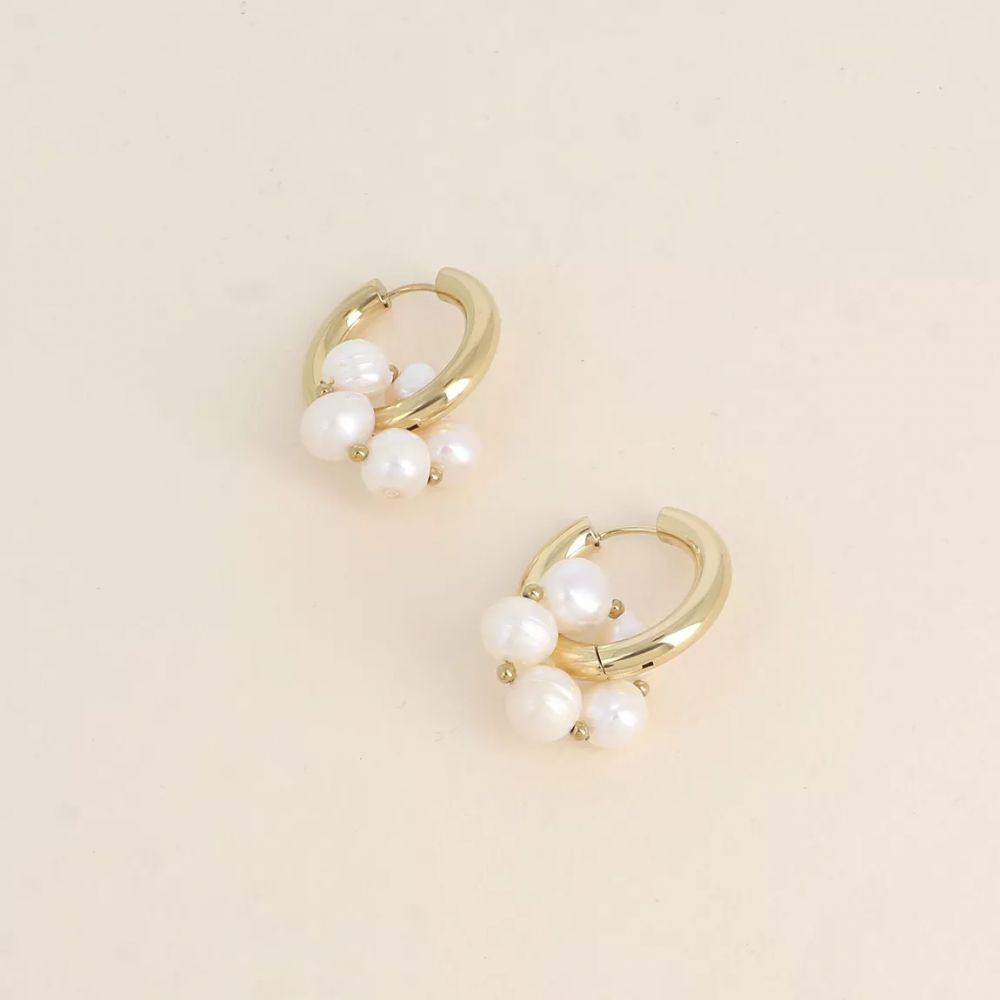 Boucles d’oreilles type créoles avec fermoir à charnière en acier inoxydable composées d’un anneau embelli par des perles d’eau douce.