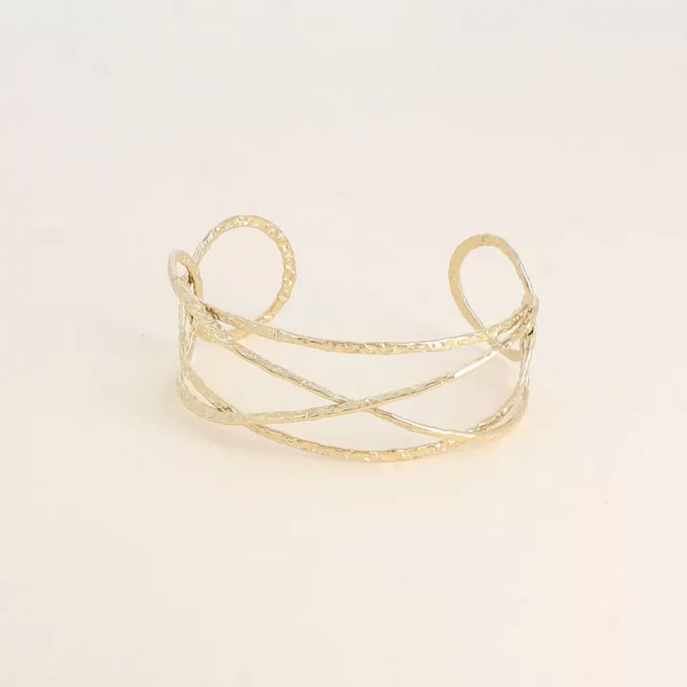 Bracelet type manchette en acier inoxydable composé de 3 anneaux entrelacés et martelés.