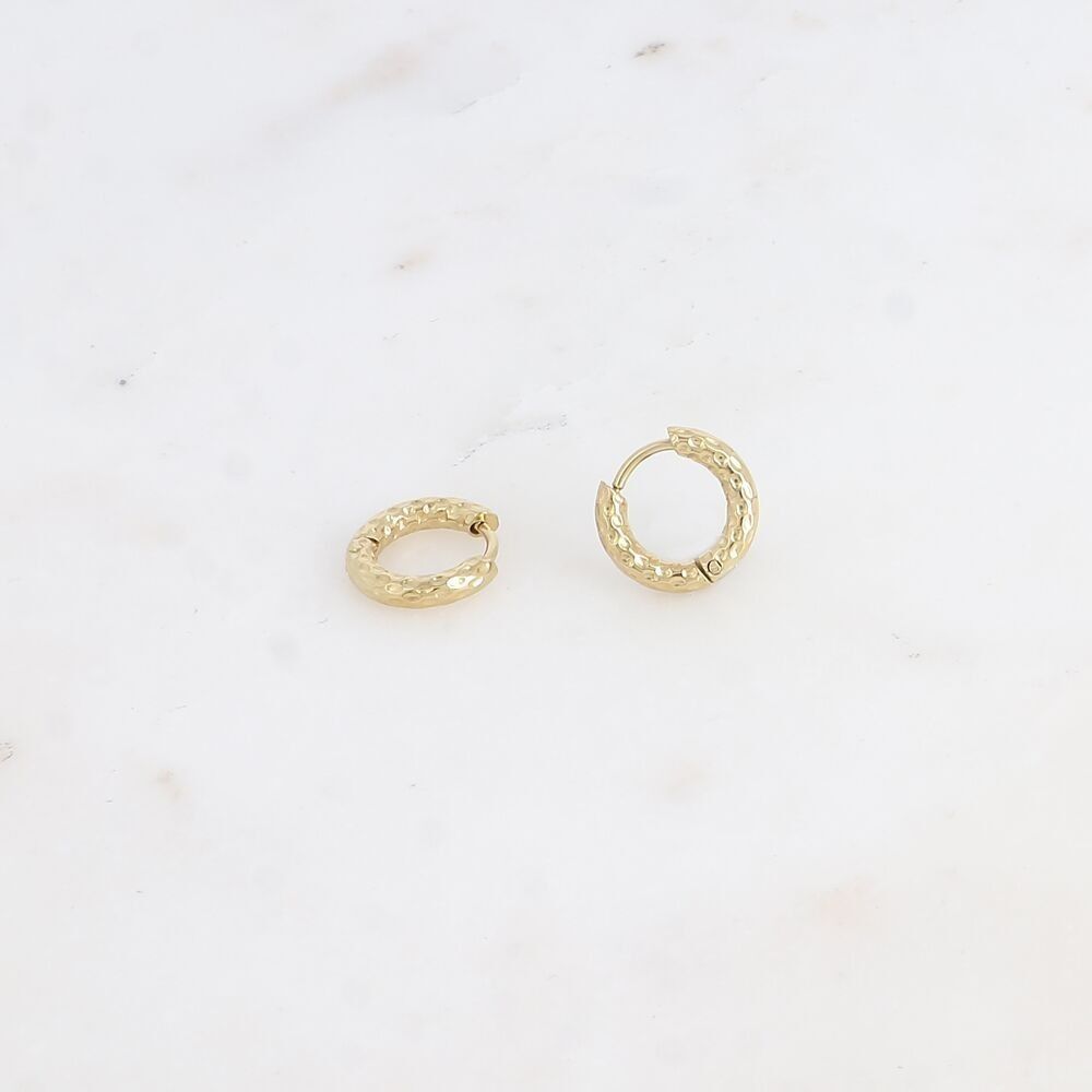 Boucles d’oreilles type mini créoles avec fermoir à charnière en acier inoxydable composées d’un petit anneau martelé style léopard.