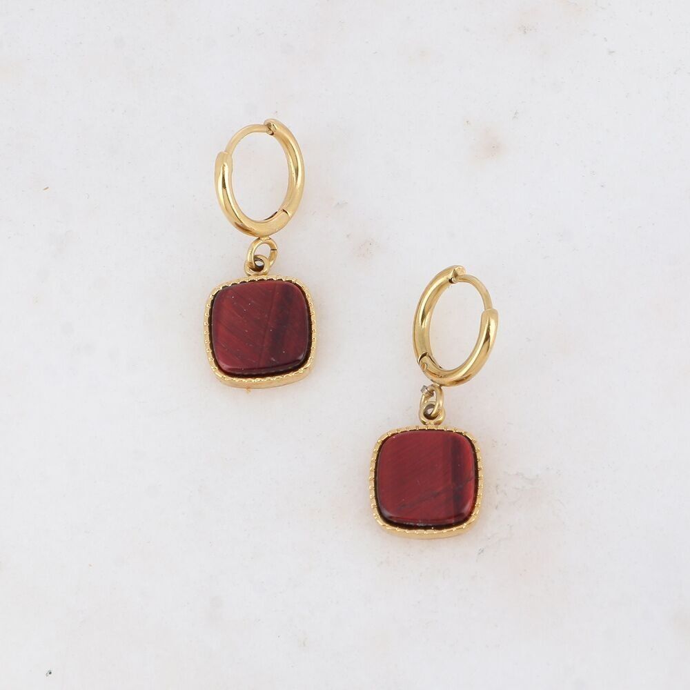 Boucles d’oreilles type créoles à fermoir charnière en acier inoxydable ornées d’un pendentif carré en pierre naturelle.