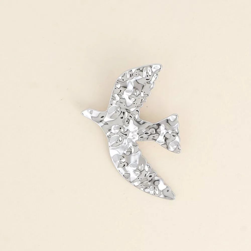 Broche type pin’s en acier inoxydable composé d’un motif oiseau texturé.