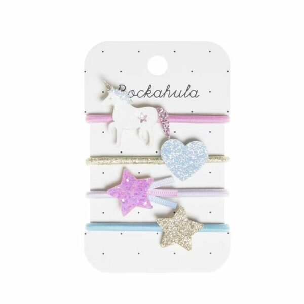 Nous croyons aux licornes ! Et vous aussi, avec nos poneys licornes scintillants ! Symbolisant l’amour, la grâce et la beauté, cet élégant pack de quatre élastiques comprend notre licorne, un cœur pailleté, une étoile dorée et une étoile filante rose.