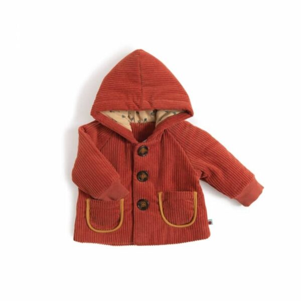 Manteau couleur rouille, en velours côtelé 100% coton et doublure en jersey à motif. Capuche, petites poches et boutons effet corne. Bord-côtes aux manches.