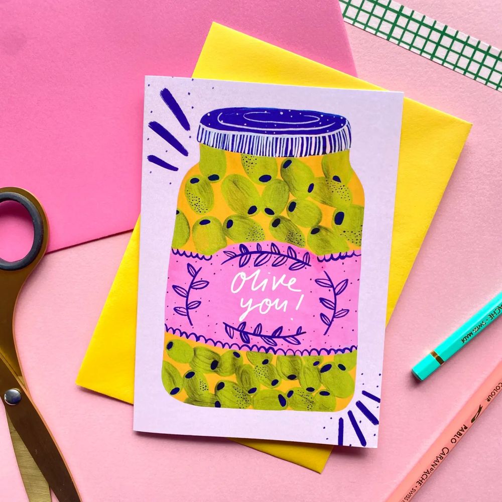 La théorie de l’olive est réelle ! Rappelez-leur pourquoi vous êtes le couple parfait avec cette carte neutre en termes de genre, présentant une étiquette rose vif sur un bocal d’olives bien rempli sur un joli fond pastel.